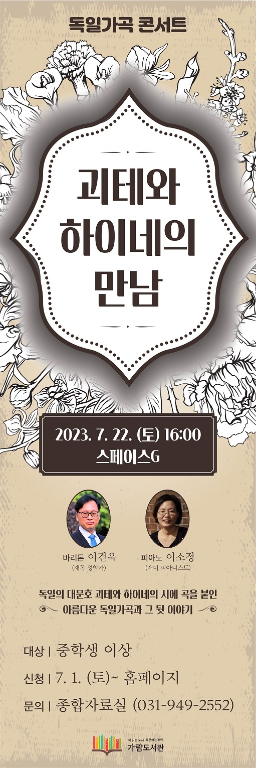 파주시 가람도서관은 독일에서 활동하고 있는 성악가 이건욱을 초청해 7월 22일, 파주시 가람도서관 스페이스지(G)에서 독일가곡 공연을 연다.