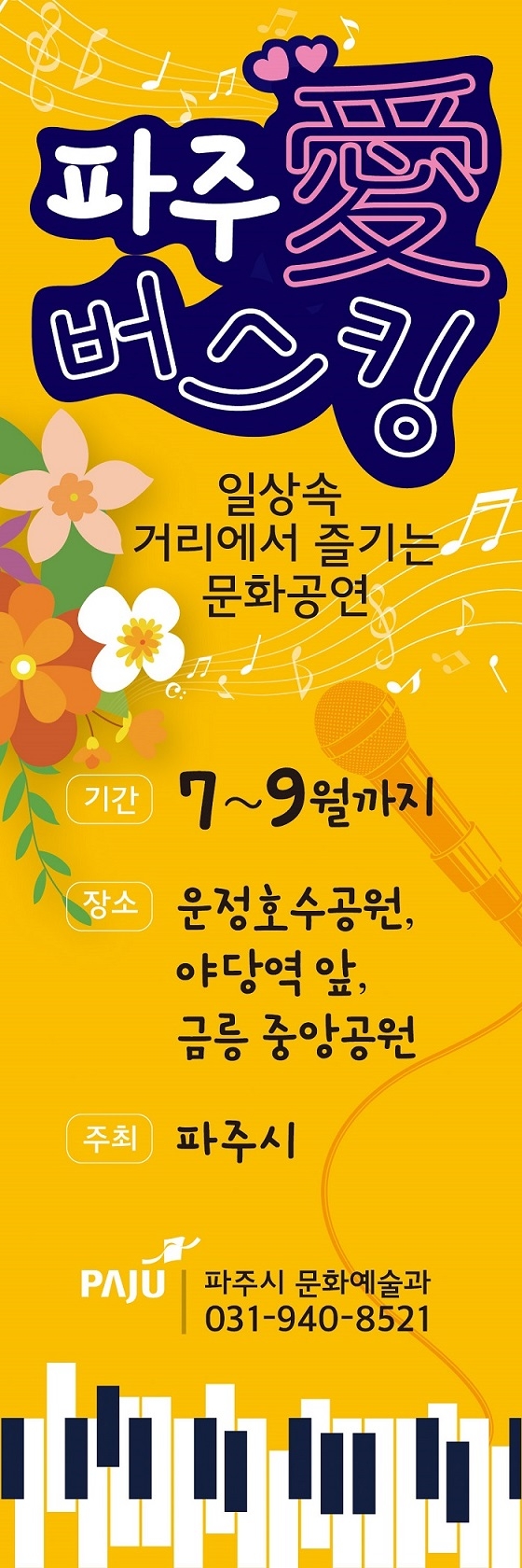 파주시는 거리공연 문화를 활성화하기 7월부터 9월까지 매주 토요일 관내 거리 및 공원, 광장 등에서 ‘파주애(愛)버스킹’ 공연을 진행한다.