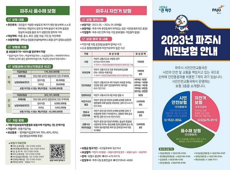 파주시는 시민안전교통국 산하 소관부서에서 관리하는 시민보험(▲시민안전보험 ▲풍수해보험 ▲자전거보험)의 내용을 하나의 홍보물에 담아 파주시 전 부서 및 읍면동에 1만 2천 부를 배부했다.