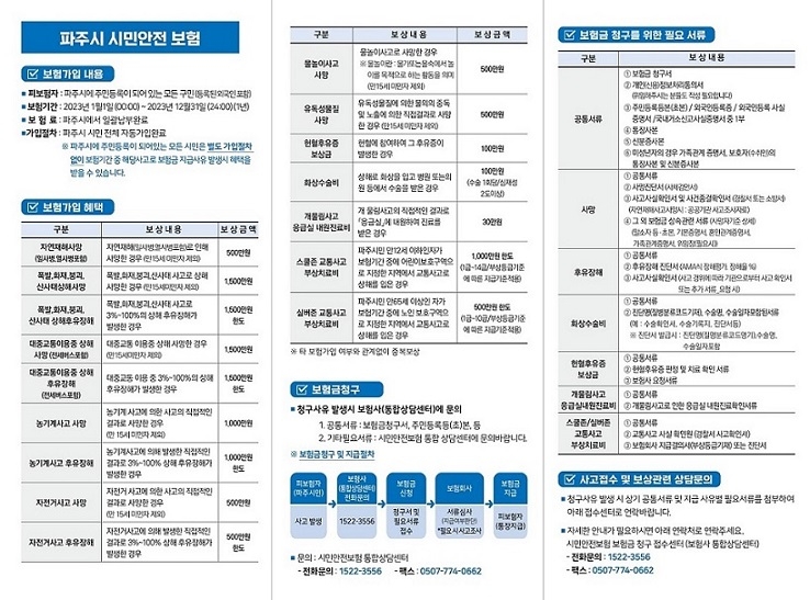 보험대상은 파주시에 주민등록을 두고 있는 모든 시민(등록외국인 포함)은 별도의 가입 절차 없이 자동 가입된다. 보험료는 파주시가 전액 부담하고 ▲자연재해 사망 ▲폭발·화재·붕괴 사망 및 후유장해 ▲대중교통 사망 및 후유장해 ▲농기계 사고 및 후유장해 ▲물놀이 사고사망 등 총 16가지의 보장항목에 해당하는 사고를 당하면 보험사(☎1522-3556)를 통해 혜택을 받을 수 있다.