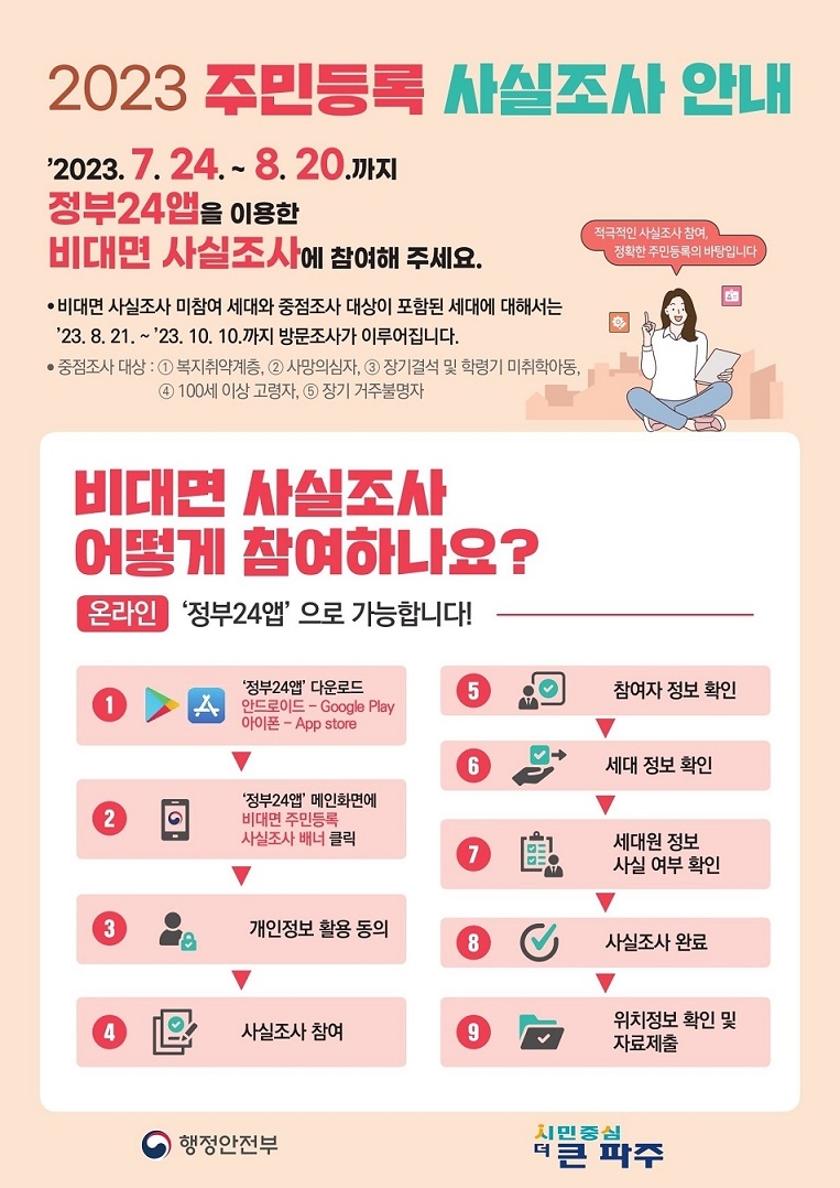 이번 사실조사는 ‘정부 24앱’을 통한 비대면-디지털 조사(7.24~8.20.)를 선행한 후, 해당 조사에 참여하지 않은 세대와 중점 조사 대상자를 이·통장 및 읍면동 공무원이 직접 방문하는 방문조사(8.21.~10.10.)로 진행된다.