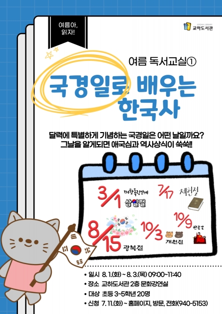 주제 중심 독서 교실은 ‘국경일로 배우는 한국사’를 주제로 8월 1일부터 3일까지 문화 강연실에서 진행하는데, 국경일의 배경지식이 부족하고 관련 역사를 어려워하는 어린이를 대상으로 한국사를 일상에 더욱 가깝게 느낄 수 있도록 수업을 진행할 예정이다.
