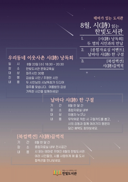 파주시 한빛도서관은 특정 분야에 대한 시민들의 관심을 높이고, 나아가 문학을 매개로 이웃과 소통하는 기획를 제공하고자 시(詩)를 주제로 8월 한달 간 다양한 독서행사를 운영한다.