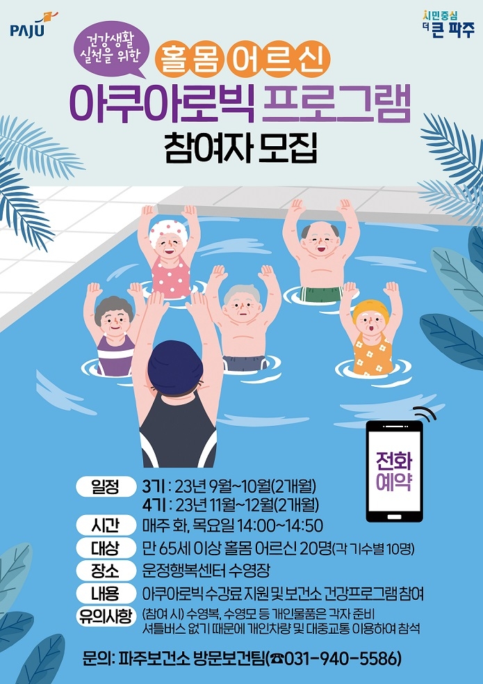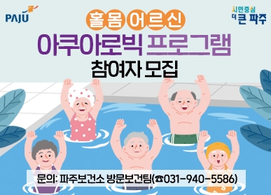 파주보건소는 건강증진과 체력 향상을 위해 마련된 아쿠아로빅 프로그램 3·4기 참여자를 모집한다. 대상은 만 65세 이상 홀몸 어르신이며, 각 기수별로 10명씩 총 20명을 모집한다.