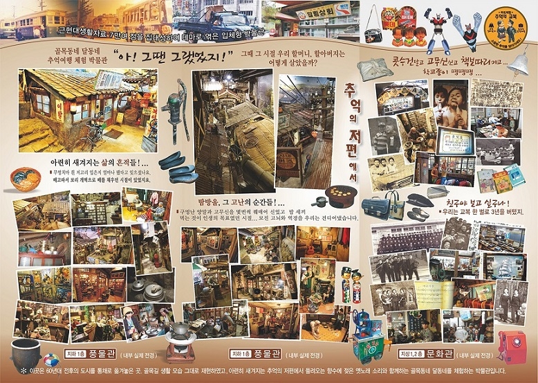 지상 1~2층의 문화관은 20개 세트가 주제별로 구성 전시되어 있다. 문방구, 헌책방, 만화방, 교실 풍경, 레코드 가게, 중화요리점, 교복점, 분식점, 군 내무반, 새마을 회관, 안내소(옛날 물건 백화점), 아날로그 가전품, 소형삼륜차(삼발이), 자전거를 개조한 오토바이 등을 섬세하게 재현해 근현대의 문화 변천을 체험할 수 있다.