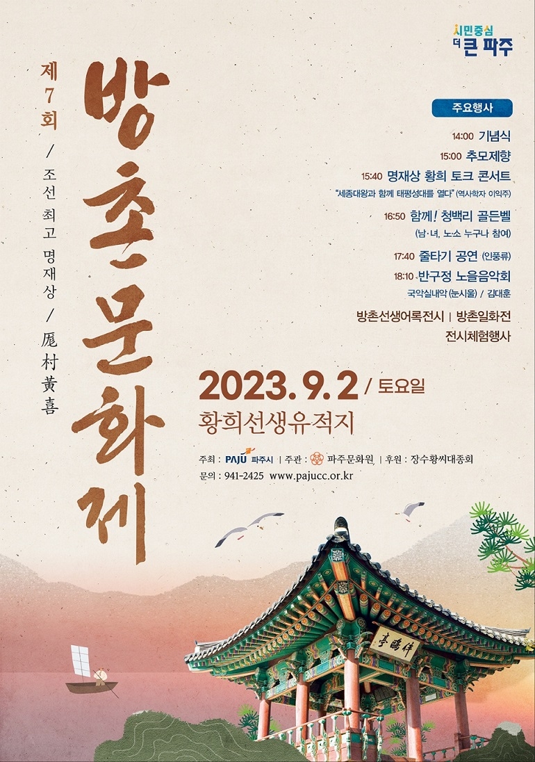 파주시는 내달 2일 황희 선생 유적지에서 위대한 명재상, 청백리 방촌 황희 선생의 유덕을 추앙하고 가르침을 되새기고자 ‘제7회 방촌문화제’를 개최한다.