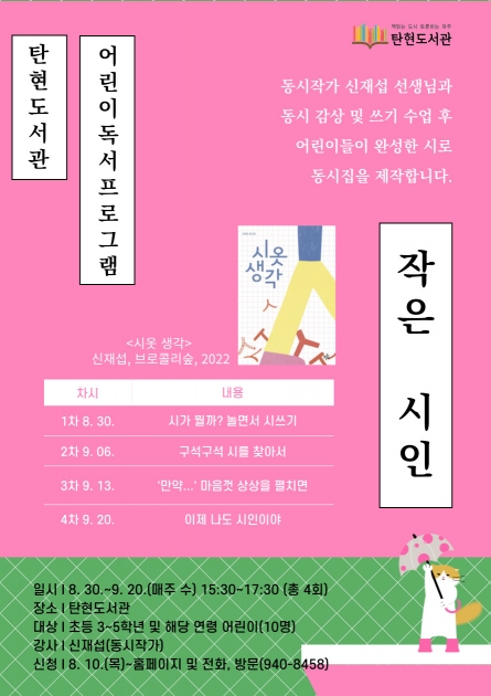 파주시 탄현도서관은 8월 30일부터 9월 20일까지(매주 수) 총 4회에 걸쳐 어린이 독서프로그램 「작은 시인」을 운영한다.