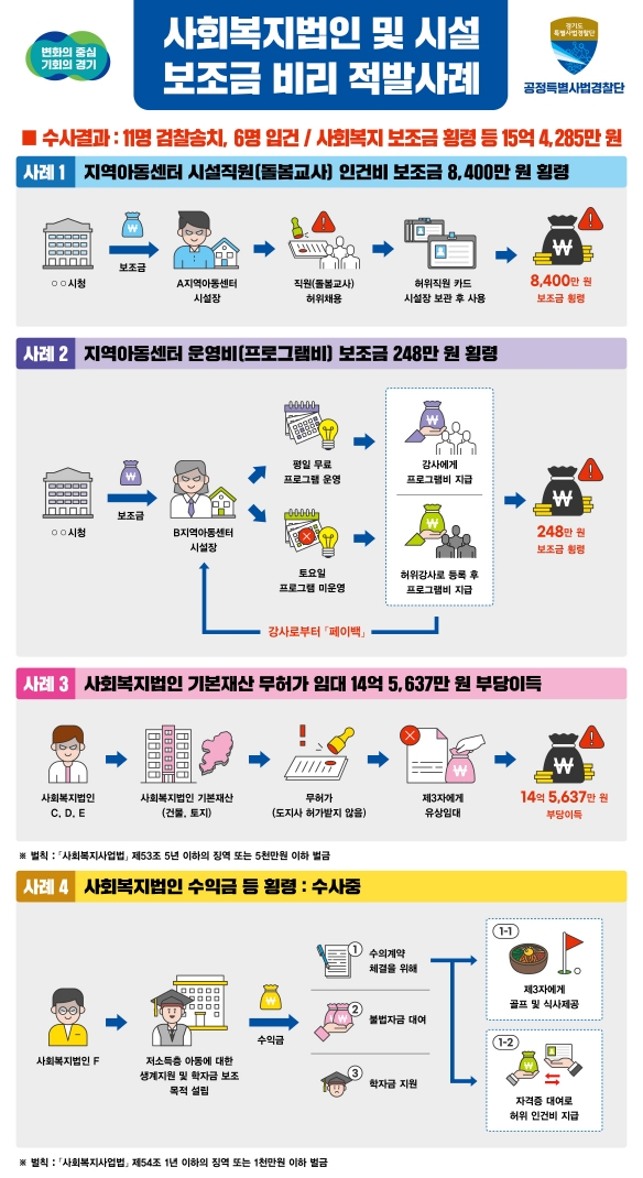 경기도 특사경, 사회복지법인·시설 보조금 횡령 등 17명 적발. 부당이득 15억원 넘어