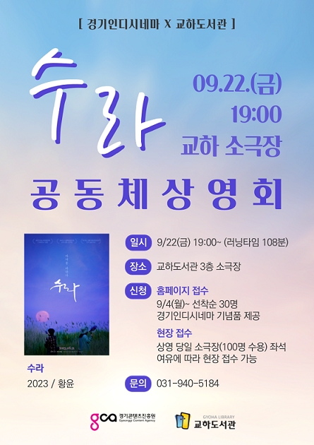 임봉성 교하도서관장은 “이번 공동체상영회를 통해 전시 대표 작품으로서, 국내 수작 독립영화인 <수라>를 많은 시민들에게 소개하고, 함께 이야기 나누는 시간을 갖고자 한다”라고 전했다.