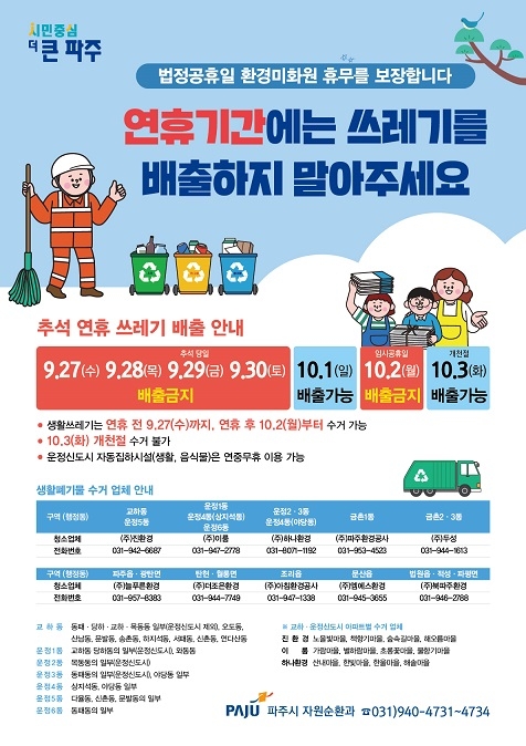 파주시는 환경미화원이 휴무를 보장하기 위해 추석 연휴 기간(9.28.~10.1.)과 개천절(10.3.)에는 생활 쓰레기를 수거하지 않는다고 밝혔다.
