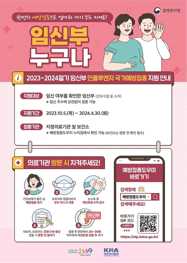 ▲생후 6개월~13세(2010.1.1.~2023.8.31. 출생자) 어린이 중 생애 첫 독감 예방 접종을 접종하는 어린이는 23년 9월 20일~24년 4월 30일 ▲독감 1회 접종 대상 어린이 및 임신부는 23년 10월 5일~24년 4월 30일이다.