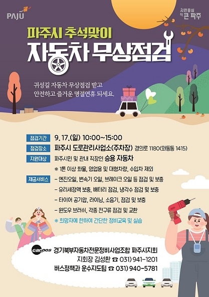 파주시는 추석을 맞아 시민들의 귀향길 안전운행을 지원하기 위해 9월 17일 10시부터 15시까지 도로관리사업소 주차장(경의로 1180)에서 자동차 무상점검을 실시한다.