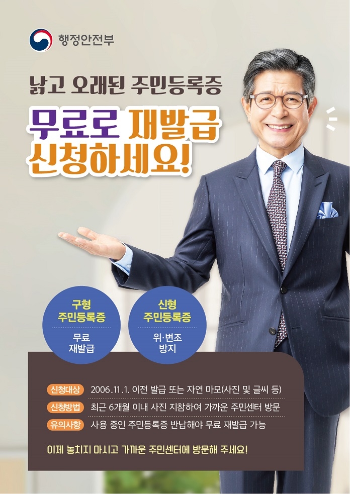 이명희 민원봉사과장은 “주민등록증 보안 강화 이전에 발급된 주민등록증은 위변조에 취약하고 범죄에 노출될 우려가 높으므로, 범죄 예방과 시민 안전을 위해 보안이 강화된 신형 주민등록증을 재발급받으실 수 있도록 지속적으로 홍보하겠다”라고 밝혔다.