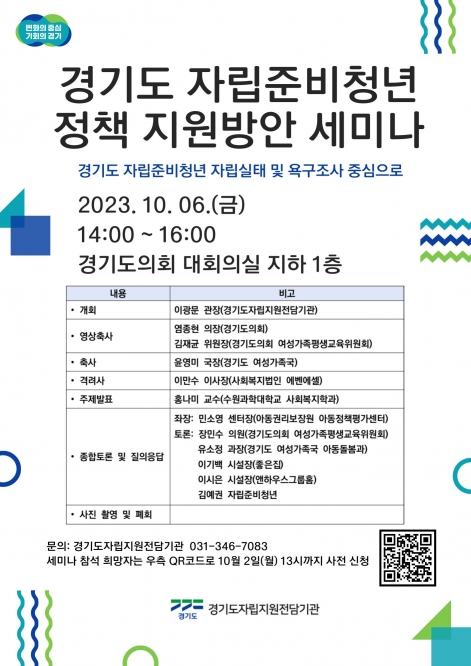 경기도는 6일 경기도의회 지하 1층 대회의실에서 경기도 자립준비청년 청책 지원방안 세미나를 개최했다.