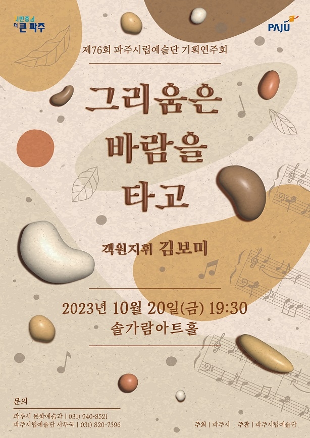파주시가 오는 10월 20일(금) 솔가람아트홀에서 객원지휘자 초청 연주회 ‘그리움은 바람을 타고’를 개최한다.