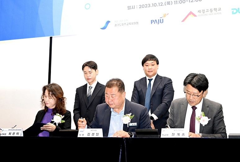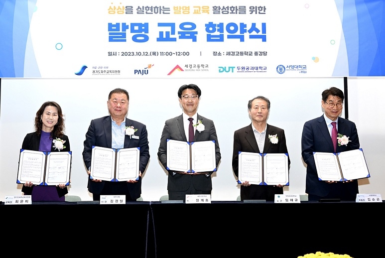 파주시는 12일 세경고등학교에서 세경고등학교, 서영대학교, 두원공과대학교, 파주시 교육지원청과 창의인재 육성을 위한 발명 교육 활성화 협약식을 가졌다.