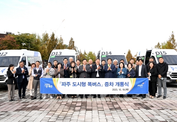 파주시는 19일 파주시 운정호수공원 내 광장에서 운정지구와 교하지구를 운행하는 수요응답형 버스인 ’도시형 똑버스‘ 증차 개통식을 개최했다.