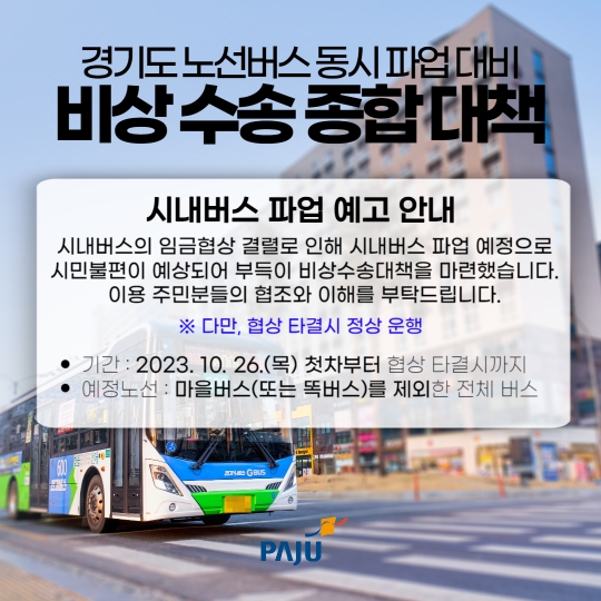파주시는 경기도 노선버스 노사협상이 최종 결렬될 경우 10월 26일(목) 첫 차부터 운행 차질이 예상됨에 따라 비상수송대책을 마련했다.