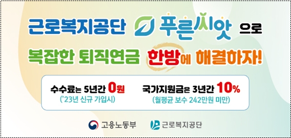 - 2023년 말까지 푸른씨앗 신규 가입시 향후 5년간 수수료 면제 및 저소득 근로자에 대한 사용자부담금 10% 3년 지원의 한시 혜택이 있다고 하며, 푸른씨앗 가입을 원하는 30인 이하 사업장은 근로복지공단 퇴직연금 전담 콜센터(1661-0075) 또는 공단 퇴직연금 홈페이지(pension.comwel.or.kr)를 통해 가입할 수 있다.