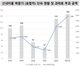 산내마을 학원가 승합차 단속 건수는 2018년부터 증가 추세이며, 학원(학생) 승하차 용도로 사용하는 승합차량의 단속 건수는 2018년 100건에서 2023년 9월 현재 146대로 5년간 약 46% 증가했다.