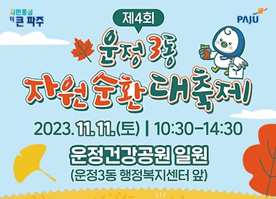 제4회 파주 운정3동 자원순환대축제가 11월 11일 운정건강공원 일원(동패동 1800)에서 개최된다.