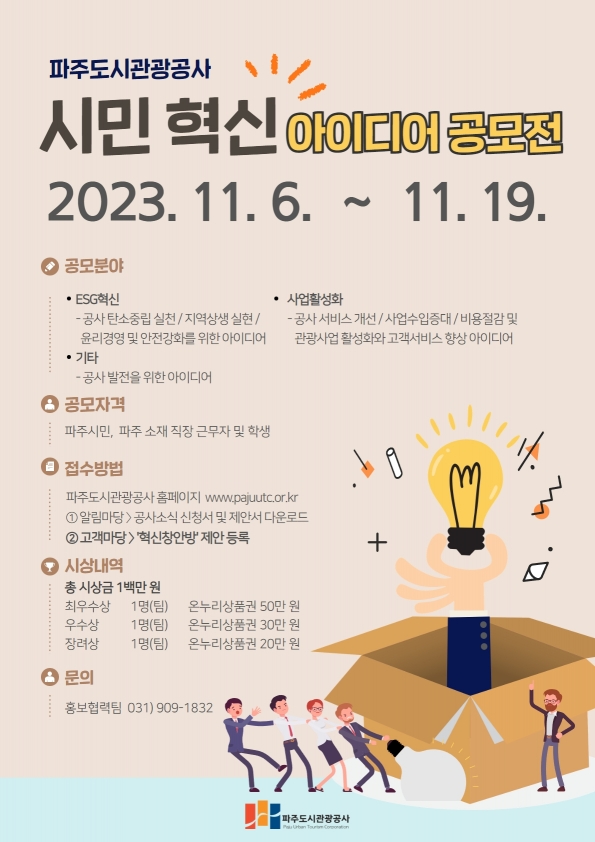 파주도시관광공사(사장 최승원)는 오는 11월 6일부터 19일까지 ‘2023 파주도시관광공사 시민 혁신 아이디어 공모전’을 개최한다고 밝혔다.