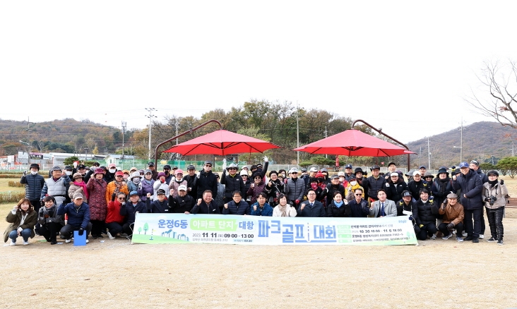 파주 운정6동 아파트 단지대항 파크골프 대회가 11일 파주시장과 많은 지역 인사들이 참석한 가운데 성황리에 치러졌다. 이번 대회는 지난 5월 가족 파크골프 대회에 이어 관내 아파트 10개 단지를 대상으로 단지별 최대 8명으로 신청받아 26개 팀 52명이 출전했다.