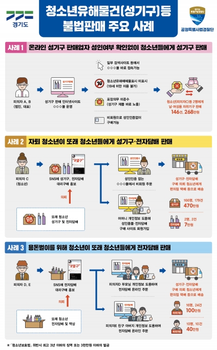 김광덕 공정특별사법경찰단장은 13일 경기도청에서 브리핑을 열고 “올해 2월부터 청소년의 정신적・신체적 건강을 해칠 우려가 있는 청소년 유해 물건인 성기구와 청소년 유해 약물인 전자담배 등을 청소년들에게 불법 판매하는 것으로 의심되는 사회관계망서비스(SNS) 계정 등을 집중수사했다”며 “그 결과 청소년보호법 위반 혐의로 청소년 3명을 포함한 5명을 적발해 검찰에 송치했다”고 말했다.