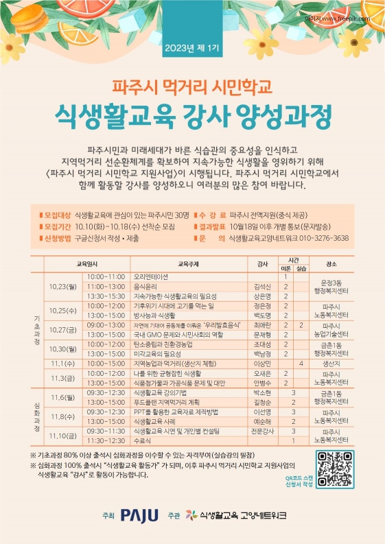 파주시는 12월 초까지 지속 가능한 식생활 교육인 ‘파주시 먹거리 시민학교’를 운영한다.