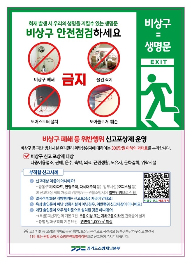 정찬영 소방서장은 “비상구는 화재 발생 시 생명의 문”이라며 “화재 발생 시 안전하게 대피할 수 있도록 하는 중요시설인 만큼 포상제도에 관심을 가지고 불법행위 근절에 동참해주길 바란다”고 말했다.