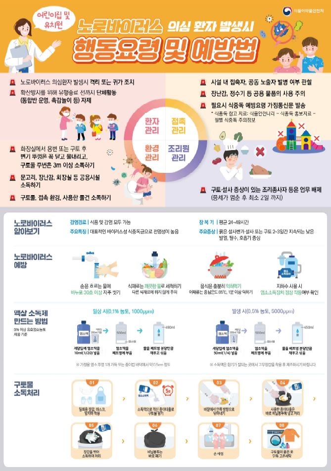 이이구 위생과장은 “영유아는 면역력이 낮아 노로바이러스에 쉽게 감염될 수 있으므로 올바른 손 씻기, 환경 소독 등을 실시해야 하며, 환자의 구토물에 오염된 물품 등에 대해 올바른 절차로 소독해야 한다”라며, “파주시는 앞으로도 특정 시기에 증가할 수 있는 식중독 예방을 위해 사전 교육과 홍보에도 최선을 다하겠다”라고 전했다.