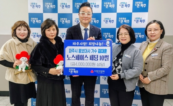 파주시는 지난 4일 파주시 홍보대사 가수 김대훈과 팬클럽 ‘빛나라 대훈’으로부터 관내 저소득 청소년을 위한 방한 패딩 10벌을 기탁 받았다고 밝혔다.