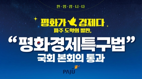 6월 13일, 평화경제특구법이 17년 만에 국회 문턱을 넘어섰다. 1만 8천여 명에 이르는 범시민 서명운동, 접경지역 시장군수협의회 정기회의 개최, 평화경제특구법 법안 제정 공청회 등을 주도적으로 이끌어가며 국회를 설득한 파주시의 노력이 드디어 빛을 봤다. 북한과 접경을 맞댄 지역이라는 이유 하나로 전후(戰後) 70년이 지나도록, 성장 발전을 위한 모든 기회로부터 소외되어 왔던 파주시가 새로운 도약의 발판 위로 올라섰다. 파주시가 평화경제특구에 지정된다면, 조세·부담금 감면 및 자금 지원 등 혜택이 주어지는 산업단지나 관광특구를 조성할 수 있어 기업 유치에 따른 고급 일자리 증대로 100만 대도시의 미래 먹거리를 확보하게 되는 셈이다.