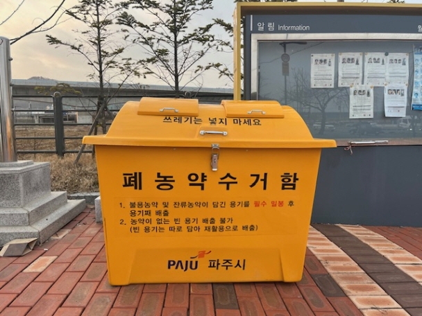 이에 파주시는 폐농약을 안전하게 수거하고 처리하기 위해 폐농약 분리수거함을 설치했으며, 시는 이번 설치를 통해 영농인들의 폐농약 배출 편의를 돕고, 폐농약으로 인한 안전사고 및 환경오염을 막을 수 있을 것으로 기대하고 있다.