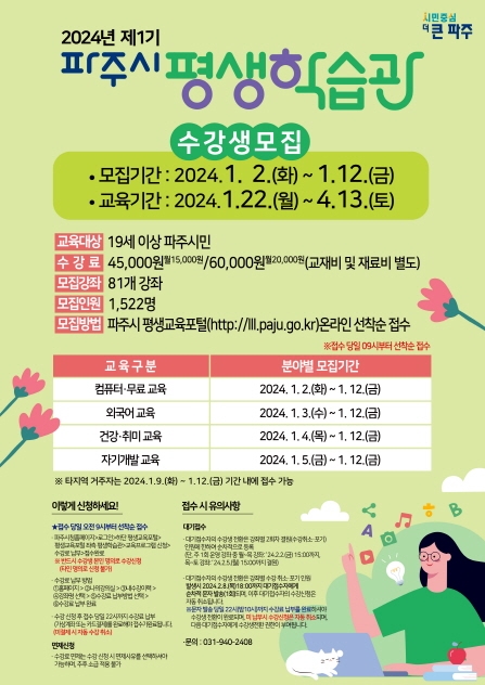 파주시 평생학습관은 1월 2일부터 12일까지 2024년 제1기 정규강좌 수강생 1,522명을 모집한다.