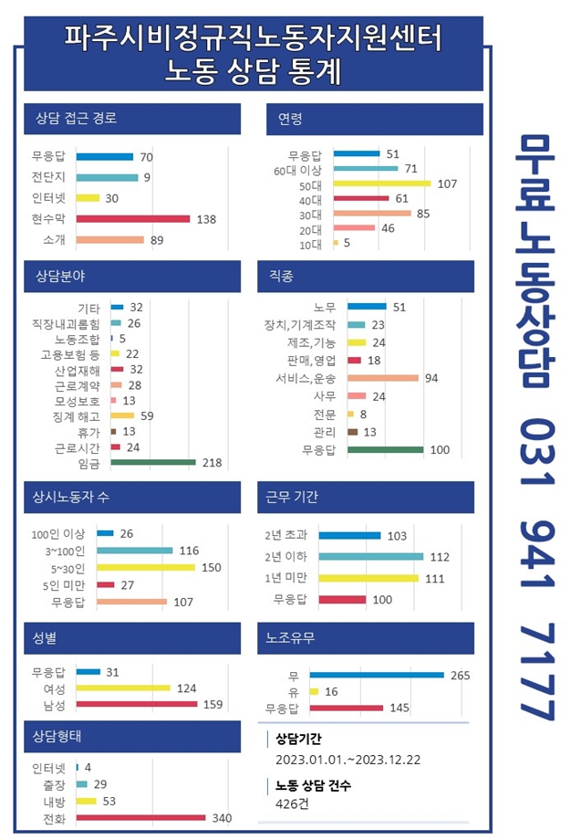 파주시가 노동자들의 권익향상을 위해 설립한 파주시비정규직노동자지원센터(이하 센터)는 지난해 426건의 무료노동상담을 진행했다. 2022년 309건이었던 상담건수가 1년 만에 117건이 늘어났다.