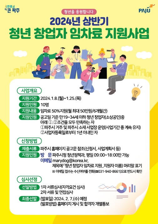 파주시는 오는 25일까지 ‘청년 창업자 임차료 지원 사업’ 상반기 참여자 10명을 모집한다.