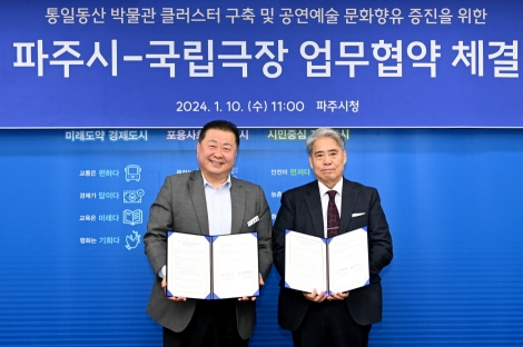 파주시와 국립극장은 1월 10일, 통일동산 내 ‘국립 박물관 문화클러스터(가칭)’ 구축 및 공연예술 문화 향유 증진을 위한 상호 교류와 협력을 강화할 것을 목적으로 업무협약을 체결했다.