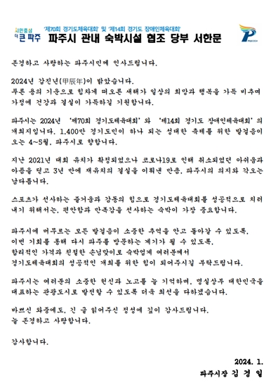 파주시, 2024 경기도체육대회 대비 숙박시설 협조 서한문 발송