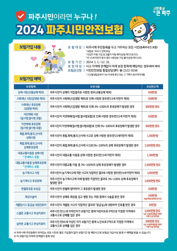 김경일 파주시장은 “예기치 못한 사고로부터 시민들을 보호하고 그에 대한 피해를 최소화하기 위한 제도를 현실에 맞게 정비하고 있다”라며 “시민들이 혜택을 놓치는 일이 없도록 홍보를 더욱 강화하겠다”라고 말했다.