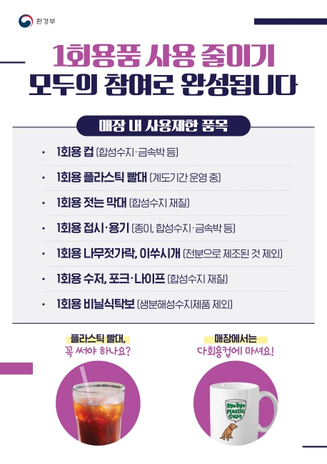 환경부는 일회용품 관리 정책을 과태료 부과에서 자발적 참여에 기반하는 지원 정책으로 전환하기로 했다. 주요 내용은 ▲식품접객업소와 집단급식소의 1회용 종이컵 사용은 규제 대상에서 제외되고 ▲플라스틱 빨대는 계도기간이 연장되며 ▲슈퍼 등 종합소매업의 경우, 비닐봉지 대신 장바구니, 종량제봉투 등 대체품 사용 문화를 정착한다는 것이다.