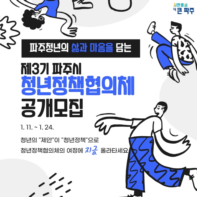 경기 파주시가 1월 24일까지 제3기 파주시 청년정책협의체(이하 ‘청년협의체’) 구성원을 모집한다. 청년협의체는 청년 문제에 대해 청년들이 함께 고민하고 의견을 모아 다양한 청년정책들을 직접 제안하는 정책 참여기구다.