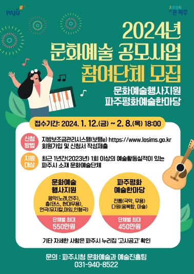2024년 문화예술 공모사업은 지역 문화예술단체 활동을 적극 장려하고 파주시민의 문화예술 향유 기회를 확대하기 위해 추진하는 사업이다.