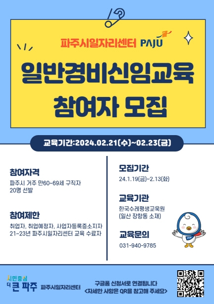 파주시는 1월 19일부터 2월 13일까지 ‘2024년 일반경비원 신임교육’ 참여자 20명을 모집한다.