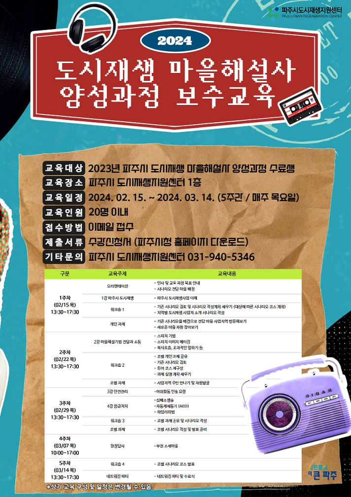 파주시는 2월 2일까지 ‘2024년 도시재생 마을해설사 양성과정 보수교육’ 참가자를 20명 이내로 모집한다.