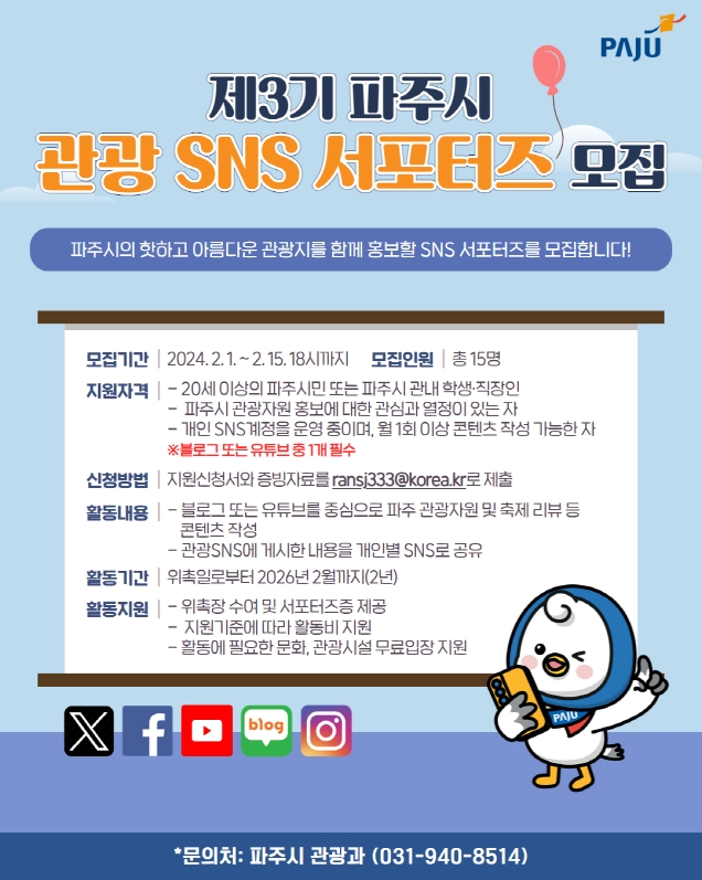 ‘제3기 파주시 관광 누리소통망(SNS) 서포터즈’ 모집