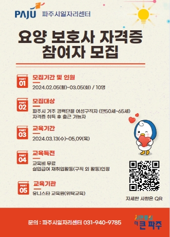 파주시가 2월 5일부터 3월 5일까지 고령사회의 유망직종인 ‘요양보호사 자격증 과정’ 참여자를 모집한다.