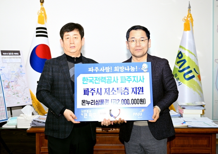 파주시는 6일 한국전력공사 파주지사에서 설맞이 저소득 취약계층을 위한 온누리상품권 200만 원을 전달받았다고 밝혔다.