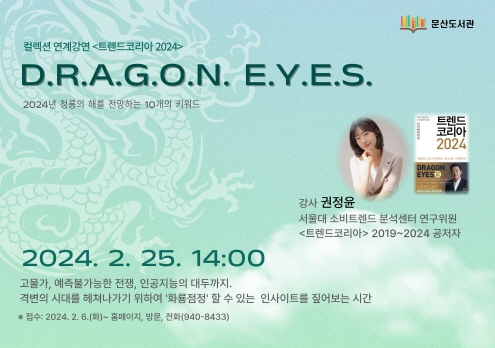 강의는 ‘트렌드코리아’의 공동저자인 권정윤 연구위원이 맡이 진행한다. 작가는 이번 강의를 통해 ‘2024년 청룡의 해를 전망하는 핵심 단어의 현상, 원인 및 배경, 나아가 시사점을 알아본다.