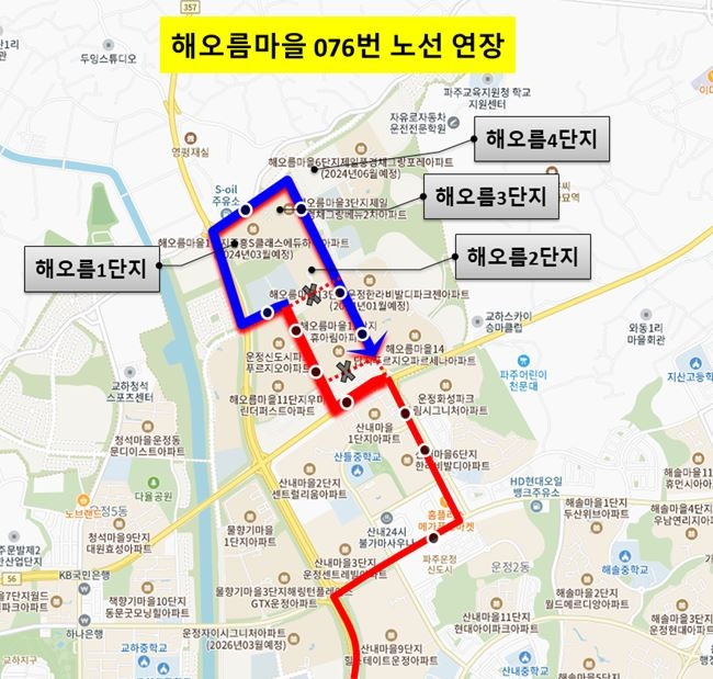 이에 파주시는 마을버스 076번의 운행 대수를 기존 4대에서 7대로 늘리기로 했으며, 이를 통해 배차간격이 15분으로 줄어들게 된다. 운행개시 시점은 버스 제작사의 출고 시기를 감안해 빠르면 5월 중 가능할 것으로 예상된다.